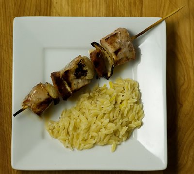 Anyway, this recipe loads up those skewers with chunks of marinated pork loin and chorizosausage, along with layers of onion (which personally does not count to me as a vegetable). That’s it! Cooks on a medium grill for about 12 minutes. In the meantime I followed Martha Stewart’s advice and cooked up a side dish of Lemony Orzo, which went perfectly with the spicy kebabs.