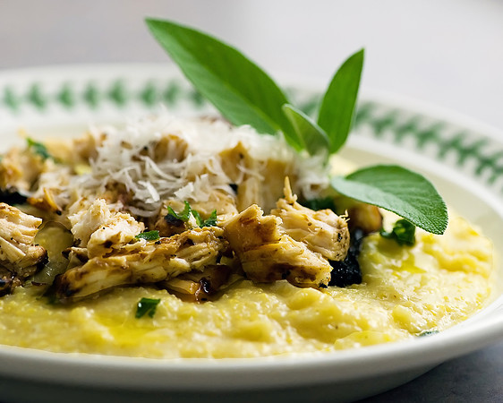 So, in comes helpful adorable Southern husband with the chicken, which he then offers to shred for me (why yes! thank you!), and it all started coming together in my mind. Nice pool of cheesy polenta on a round plate. Little mound of grilled, shredded chicken in the center. Fresh grated parmesan cheese on top of the chicken. Melted butter with chopped sage drizzled over the whole thing.