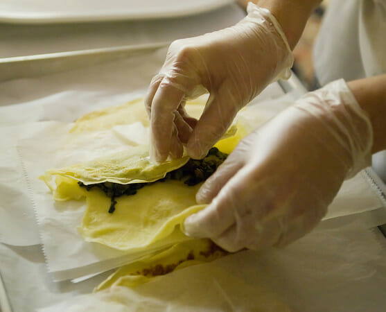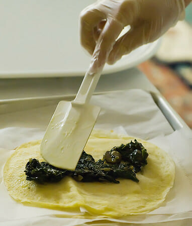 After that, the rest is easy. The spinach crepes were spread with a mixture of spinach and mushroom filling…