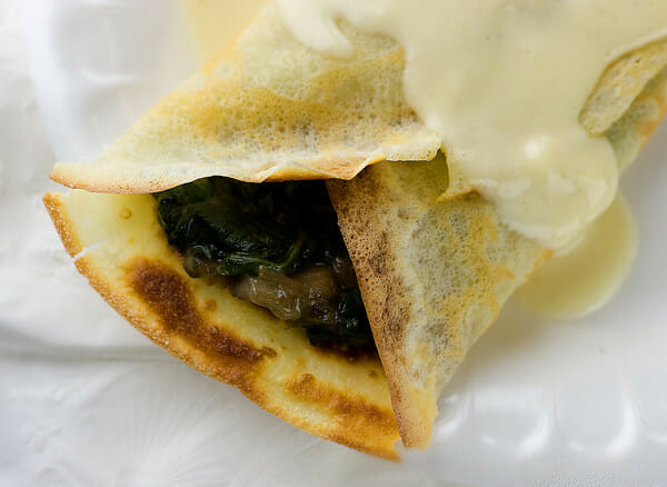 All that was left was to spoon on a little sauce (cream sauce for the spinach crepes, whipped cream for the banana crepes)….and to EAT them!
