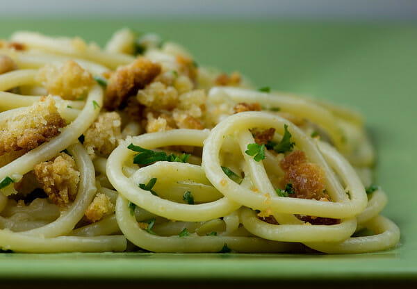 And even better, odds are you have everything you need to make it at the spur of the moment. Any long strand pasta will do, although I think good old spaghetti works best. Bread for the bread crumbs — any kind you have on hand. Butter. White wine. Fresh parsley. Parmesan cheese and fresh ground pepper. All stuff I highly recommend having in your kitchen at all times…and if you don’t, I recommend going out to get whatever is missing JUST to make this delicious little dish, which is great on its own or as a side dish for grilled chicken or fish.