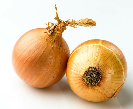 I shot the onion with a continuous fluorescent light that simulates daylight, with the light three quarters back and two silver cards bouncing the light back in for fill. The onions are on a ceramic white plate, and the shot was cropped close enough that you don't se any of the background.