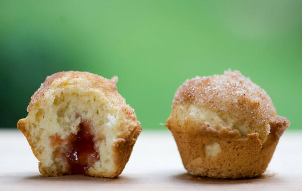 Now, a word about that little jelly guy up there. These are perfectly fine as plain old regular baby doughnut muffins, especially because the end of the recipe calls for dunking the tops of the donuts in melted butter and rolling them in cinnamon sugar. (Heart beating faster!!!) But if you want to get really fancy, you can add a little jelly to the picture.