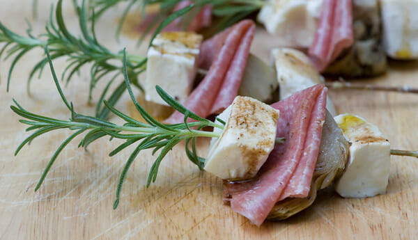 So I took the opportunity to try out a recipe I found on the always fabulous Pioneer Woman site. Sometimes on a Friday evening the Southern husband and I will skip actual dinner and just have some kind of interesting appetizer-type food for supper, and this fit the bill perfectly. You take stems of rosemary – and for obvious reasons these need to be sturdy stems (which they usually are). Strip off the leaves except for a couple of inches on the top. Then all you have left to do is skewer whatever you like on to these gorgeous smelling skewers. I used fresh mozzarella, grilled marinated artichoke hearts and pieces of genoa salami that had been folded in quarters. The original recipe called for olives as well. You could really used any kind of cheese you like, you could try sun-dried tomatoes, pieces of folded ham…you get the idea.