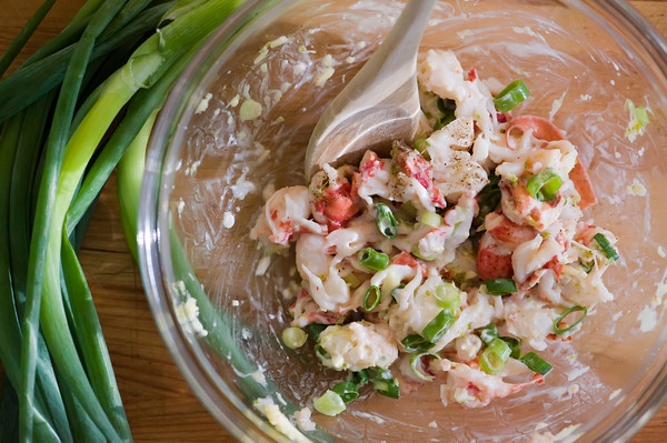 Enter the Stonewall Kitchen Favorites, which has a lobster roll recipe that has now become my favorite lobster roll recipe of all time. It’s light and creamy and classic and perfect. And EASY. You take a couple of lobsters-worth of lobster meat, tear it into bite-sized pieces, and mix it up with lime zest, lime juice, fresh ginger, chopped scallion and just the teeny-tiny-est bit of mayo.